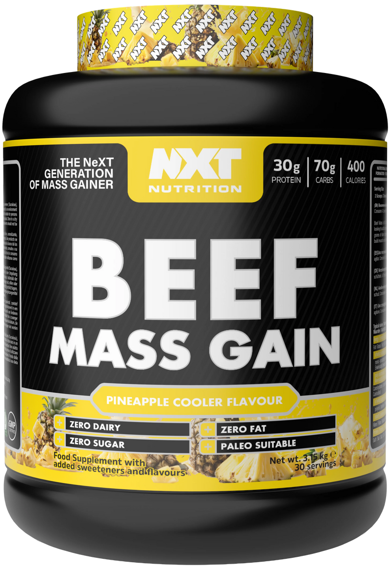Beef Mass is NXT Nutrition's advanced weight gain formula. Designed for people looking to add lean muscle mass, Beef Mass provides 30 grams of Beef Protein and 70 grams of slow-digesting carbohydrates to help provide the vital nutrients needed to build muscle and aid recovery.