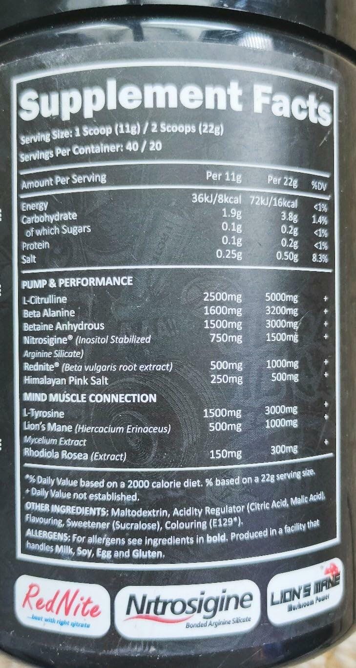 Per Serving%RI* Energy 327.27 kJ 36 kJ/Kcal 8 Carbohydrate 18.18 g 2 g Of which sugars 1.82 g 0.2 g Protein 0.91 g 0.1 g Salt 2.27 g 0.25 g PUMP & PERFORMANCE L-Citrulline 22727.27 mg 2500 mg Beta Alanine 14545.45 mg 1600 mg Betaine Anhydrous 13636.36 mg 1500 mg Nitrosigine (Inositol Stabilized Arginine Silicate) 6818.18 mg 750 mg Rednite (Beta vulgaris root extract) 4545.45 mg 500 mg Himalayan Pink Salt 2272.73 mg 250 mg MIND MUSCLE CONNECTION L-Tyrosine 13636.36 mg 1500 mg Lion's Mane (Hiercacium Erinaceus) Mycelium Extract 4545.45 mg 500 mg Rhodiola Rosea (Extract) 1363.64 mg 150 mg *Percent Daily Values are based on a 2,000 calorie diet. Your daily values may be higher or lower depending on your calorie needs.
